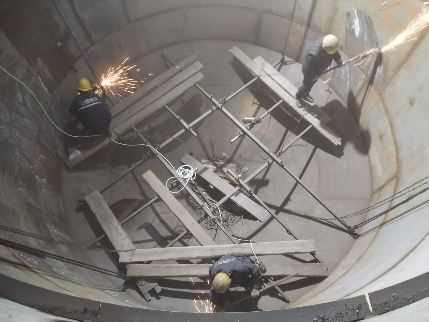 在深达6米的合介桶内,工人们身穿厚重保暖服,手持角磨机,半蹲半站打磨钢体表面。焊缝平整度直接影响贴砖质量,稍有不慎就会导致空鼓。尽管寒风刺骨、焊花四溅,3台角磨机轰鸣不断,工人们依旧一丝不苟,不放过任何一处杂质,坚决确保基面平整。